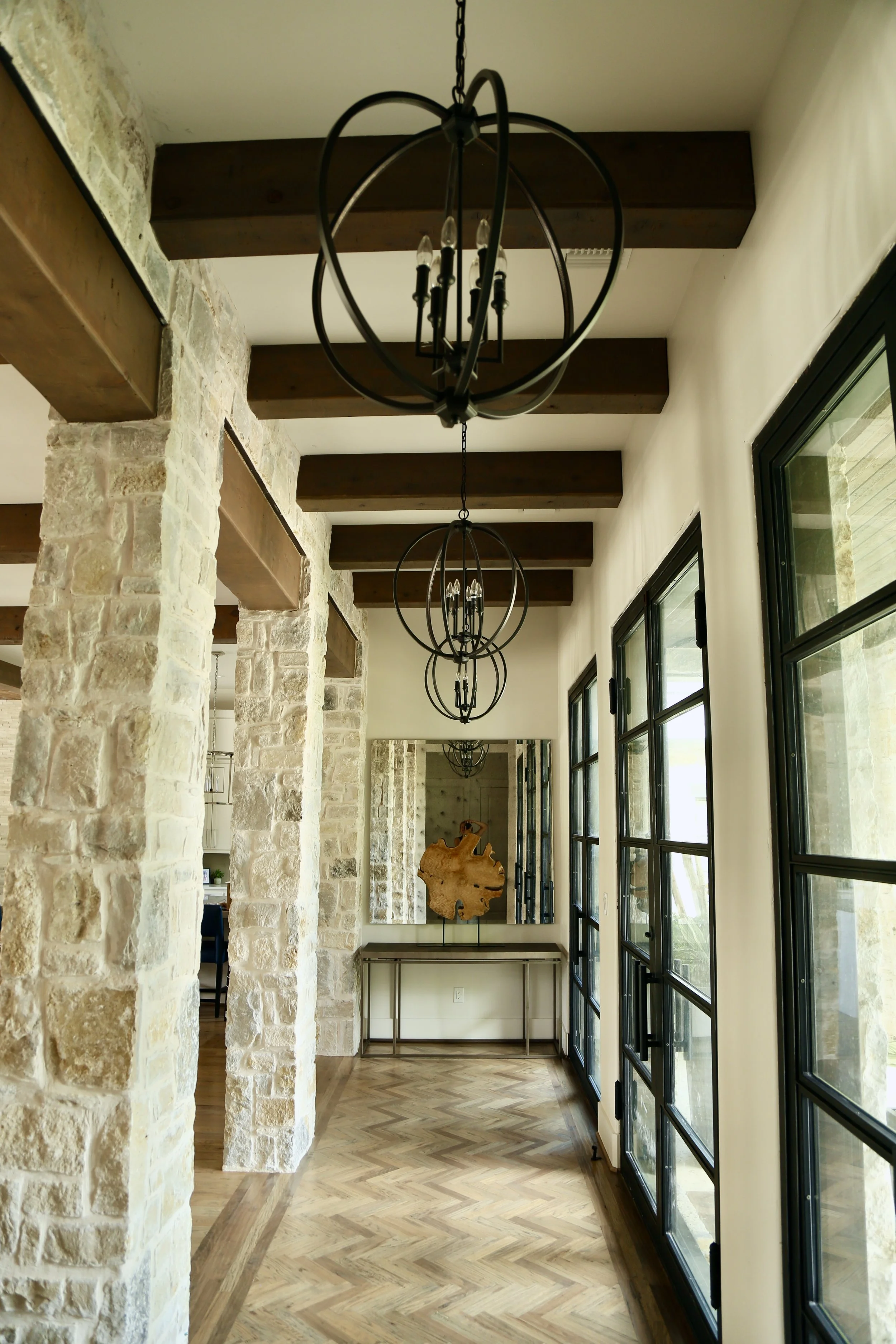 Interior view of a hallway with stone columns, hardwood flooring in a herringbone pattern, large black-framed glass doors, and black chandeliers hanging from the ceiling.